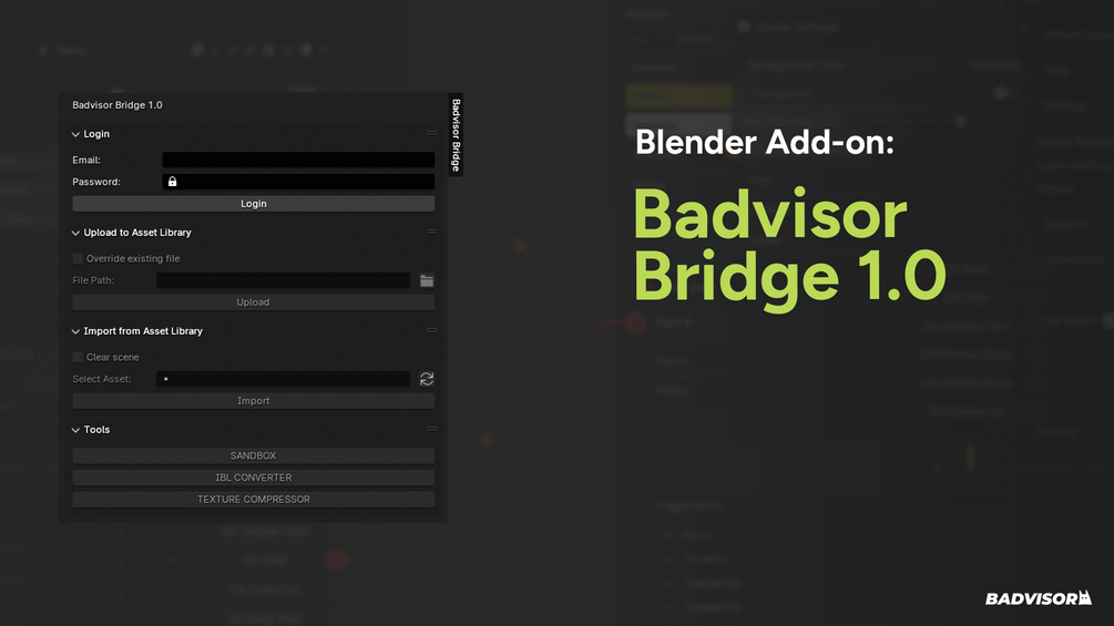 - Open directly Badvisor tools from Blender: Sandbox, IBL Converter and Texture Compressor.